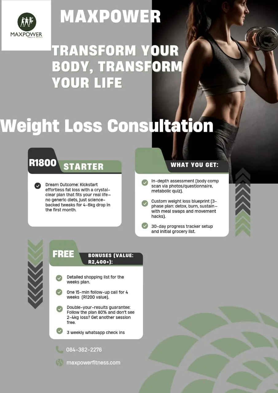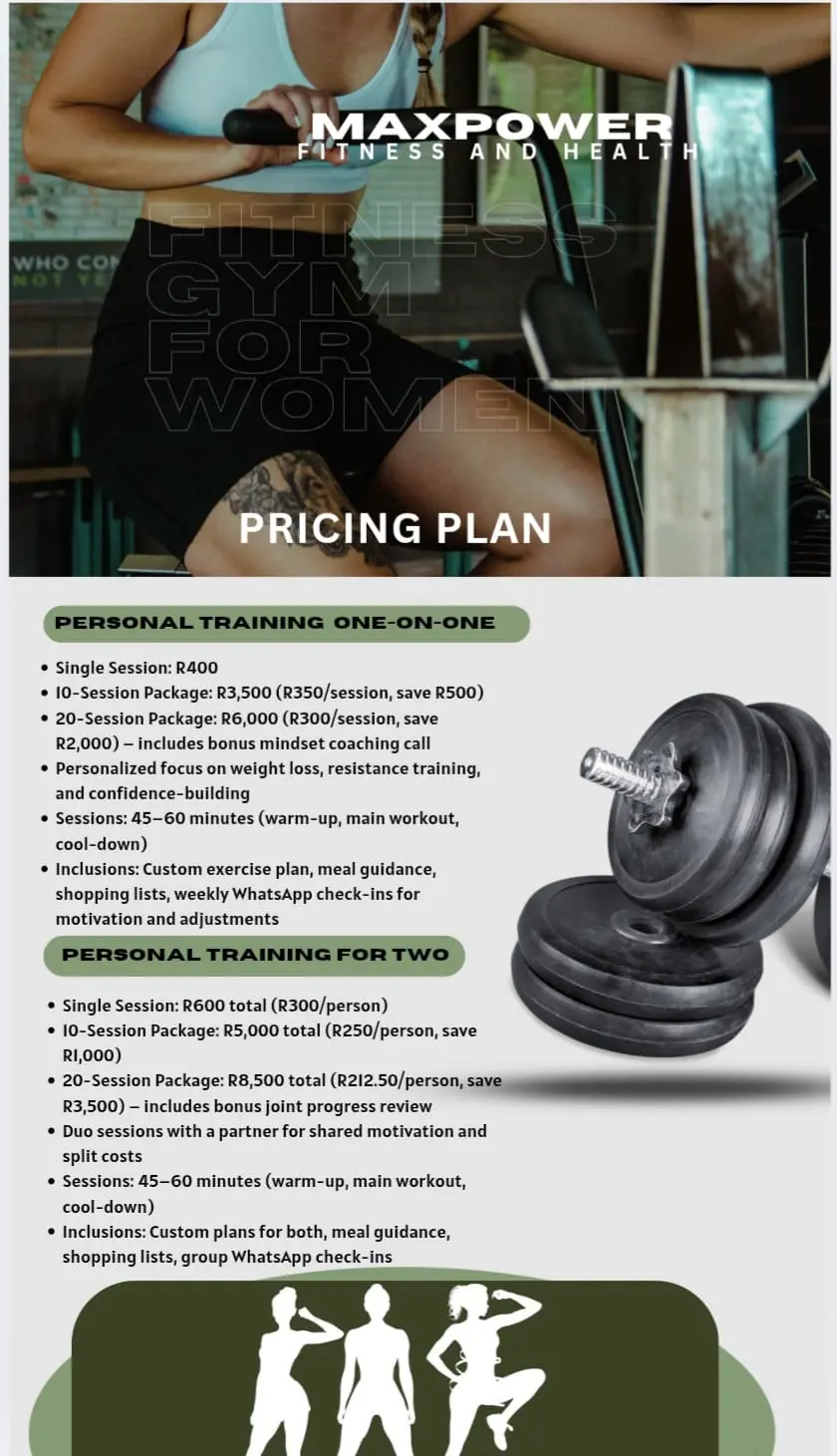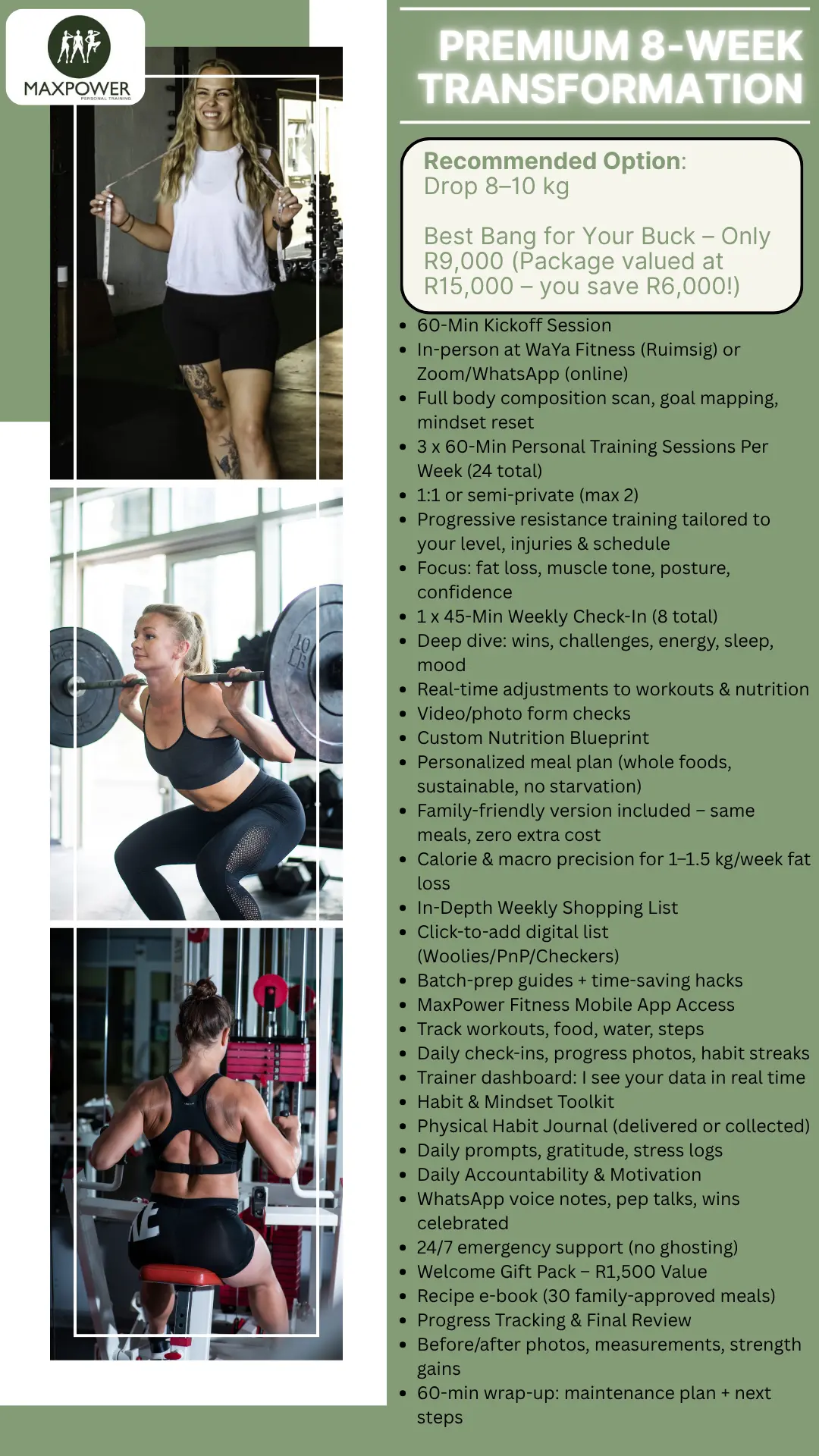 We start with a 60-min in-person , or Zoom/WhatsApp if online - kickoff. 3 x 60 min training sessions per week. 1 x 45min check in session a week to recap what works and what did not so we can readjust, custom workouts tailored to your needs. Custom made meal plan for yourself and your family (no extra meal plans for the fam!). In depth shopping list for easy shopping and seamless prep. Extras like a habit journal, access to our NEW MaxPower Fitness mobile app to track and hold yourself accountable and for me to check your progress. Daily motivation and accountability.